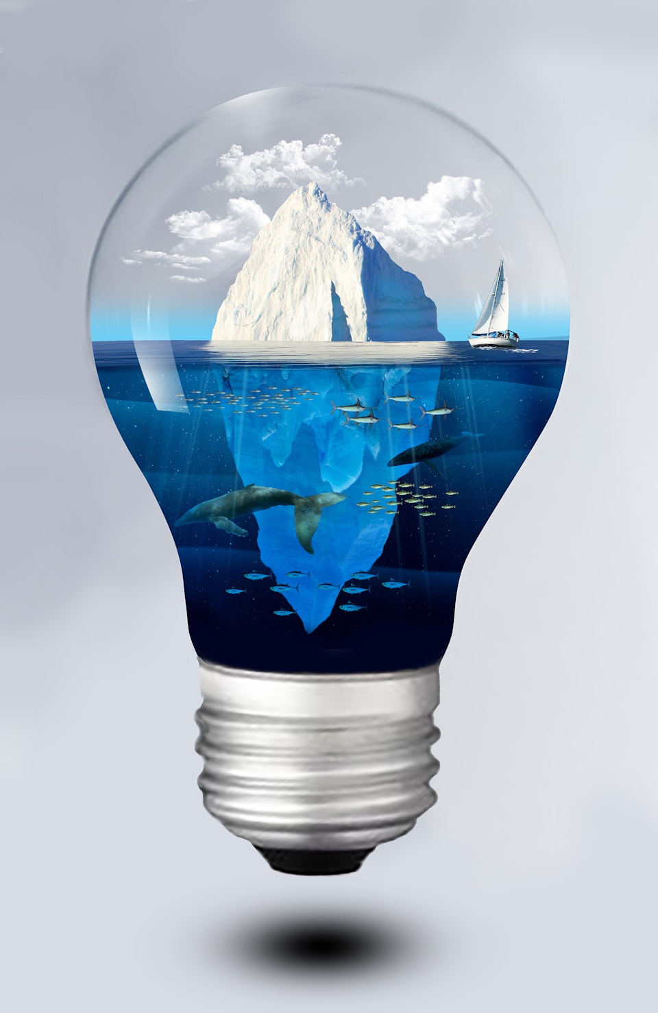 "Working with many different images to create the iceberg fish and water, i then flipped the script, and put it inside a light bulb to catch the eye of the view! Category; Photography and Photo Manipulation."