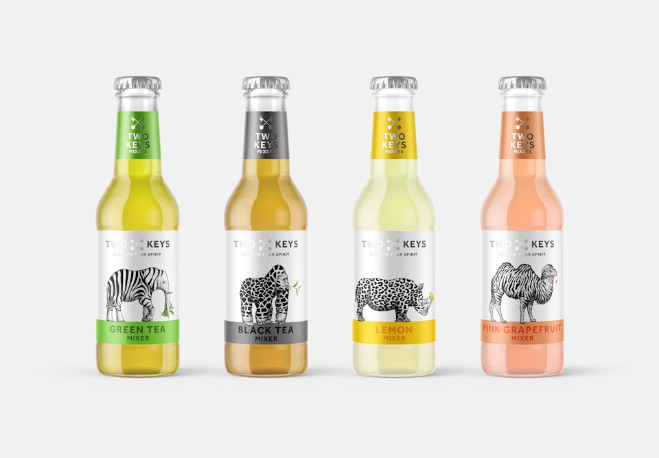 "Two Keys is a new mixer brand set to disrupt the market and create not only an alternative to the tonic market as a product but also as a visual and to add a more fun playful brand to the mix. The essence of the brand is driven by a thinking that everyone hides their true skin, who they really are and a need to celebrating their inner animal, and mix things up!"